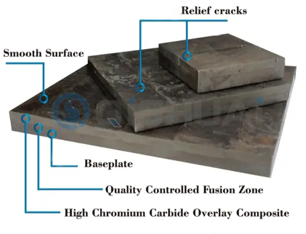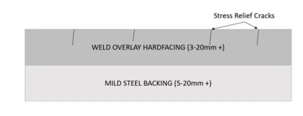 | Impacto de materiais grandes, fácil deformação ou rachaduras | 1. Dureza da camada resistente ao desgaste2. Resistência à tração do substrato3. Força de ligação entre a camada de liga e o substrato | 1. Substrato de alta tenacidade 2. Camada resistente ao desgaste ligada forte e resistente | Soldagem, soldagem de plugue, dobra (a ser avaliada) |